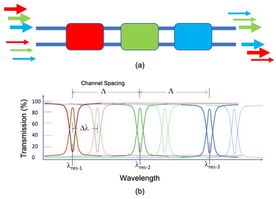 Now let us add EO resonance shifting (electrical control) to each wavelength-dedicated 2 × 2 add–drop. A simple-but-effective switch is the cascade connection of three different 2 × 2 switches, as is shown in Figure 11a. This is a wavelength-multiplexed crossbar switch, with each 2 × 2 color “element” being independently controlled. The lower diagram shows the composite spectrum of the device, illustrating individual TO shifts for red, green, and blue. As discussed in [], a given color input is on resonance for one element (the cross state there) and is off resonance for all other elements (the bar state there). A given element can be shifted from the cross state to the bar state. This multi-crossbar approach is illustrated in Figures 3 and 4 of [].
