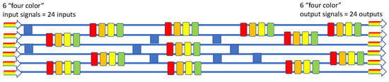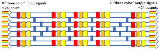 Our next wavelength-selective switch has eight input channels and eight output channels, each containing three “color signals.” Starting from the monochromatic 8 × 8 in Figure 5 of [], we expanded that to the wavelength-MUXed application by employing our above Figure 11 device to invent a “24 × 24” router that employs only 60 active devices, as shown in Figure 13.
