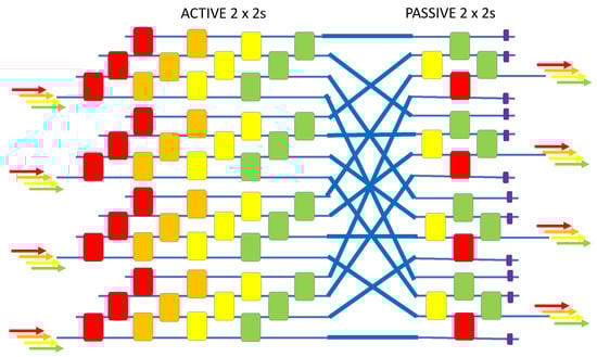 Having just described the operation of the 2 × 2 × Nλ crossbar, let us now put these devices to work in a larger-scale M × M × Nλ wavelength-selective routing switch for the case of 6 × 6 × 4λ, which means that that there are four “color signals” at each of the six inputs and re-arranged (switched) four color signals at each of the four outputs. Our new design is given in Figure 12, where we also deploy multiple 2 × 2 crossovers (blue squares here). This diagram is a highly modified version of the monochromatic 6 × 6 utilizing MRRs presented in [], where one modification is the replacement of MRRs with our four-color crossbars. If we visualize this as a 24 × 24 router, then the number of active and passive components employed to accomplish the wavelength routing (48 and 9, respectively) is relatively small.