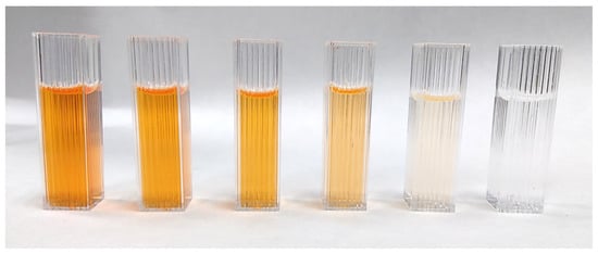 The purpose of the first experiments carried out with the photoreactor was to make sure that the photocatalysis process occurs. This fact was tested out by simply visually checking up, as shown Figure 8. At the beginning, the solution has an orange colour, and at the end of the process, the colour of the solution should be completely white.