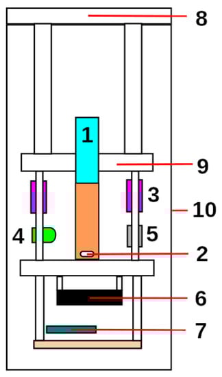 Reactor architecture diagram: (1) test tube, (2) stirrer bar, (3) UV LEDs, (4) transmittance LED, (5) sensor, (6) stirrer motor, (7) Arduino Nano Every, (8) top cover, (9) inner support and (10) housing.