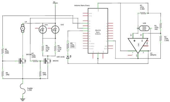An electronic circuit was designed specifically for this device. Its schematic was made with Fritzing software and is shown in Figure 4. Two micro USB connectors powered the reactor. One came from the USB connection of the computer and was used as a communication interface with the control software to power the Arduino board and the components responsible for measuring the transmittance, both the light source and the sensor, and its signal conditioning circuit. The other was a 5 V power supply line that came from a micro-USB female connector designed to be connected to a USB power adapter. This split was done to comply with the limits of the USB 2.0 standard, which limits the current to 500 mA, since it was not known if the computer to which the reactor would be connected supported a higher current demand, and in order to avoid overcurrent and voltage drops that could crash or reset the microcontroller.