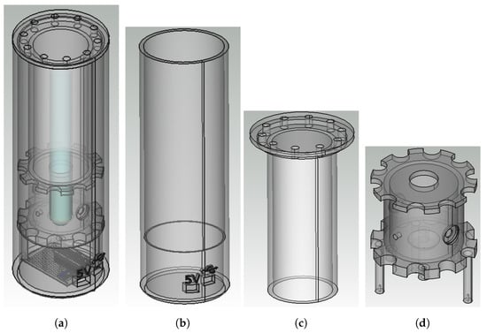 3D models of the parts of the reactor: (a) 3D reactor, (b) housing, (c) top cover and (d) inner support.