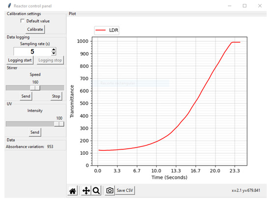 The software that controls the reactor from the PC is responsible for managing the communication with the reactor and for displaying the readings. It was written in Python and employs various libraries, such as Tkinter for the GUI and Matplotlib for the plotting. Figure 6 shows the interface of the program. On the left-hand side are the reactor controls grouped according to their functionality and where the user can adjust the sampling period, perform the zero adjustment process, adjust the UV intensity and adjust the stirrer power. The plotting graph occupies most of the screen. It represents an elapsed time representation of the sensor readings, which updates at the sampling frequency using an animation function. The lower part has controls that allow one to move, zoom or restore the view or take a screenshot of the graph. In addition, a button has been provided on this bar to export the readings in a CSV file.