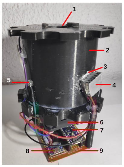 Part-wise declaration of the inner support: (1) test-tube support, (2) inner support, (3) UV LED, (4) heat dissipator, (5) transmittance LED, (6) stirrer motor, (7) Arduino Nano Every, (8) 5 V connector and (9) perfboard.