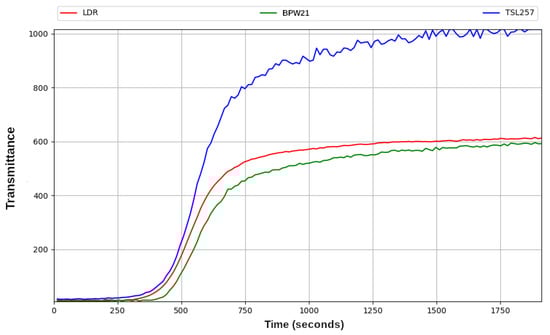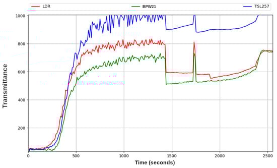The graph of the Figure 10 shows the levels of transmittance obtained from three different sensors based in different technologies (resistive sensor and photodiode). They are described in Section 2.3.
