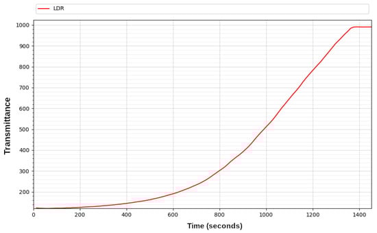 Figure 11 shows the transmittance behaviour with time generated by the LDR sensor. It can be clearly observed how the intensity of the light passing through the solution increases due to the disintegration of the dye. As can be seen in the graph, at the end of the process, the level of transmittance remains constant, which means that the colour of the solution no longer changes and that the photocatalysis process has therefore come to an end.