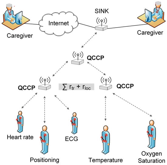 Owing to the emergence and increasing adoption of the Internet of Things (IoT), society is increasingly moving towards an always-connected model, where there are smart objects that interact with each other and with people [,]. IoT offers suitable solutions for numerous applications, such as smart cities, security, emergency services, logistics, commerce, industrial control, and healthcare [,,]. Healthcare is considered one of the areas that will benefit the most from IoT, which has led to the coining of the term Internet of Medical Things (IoMT). IoMT [,] includes devices with multiple sensors placed on, near, or inside a patient to collect vital sign data and wirelessly transmit it to the sink node via hop-by-hop (see Figure 1). In turn, the sink node connects to the Internet to send the data to an application that can process the data to detect abnormalities in a patient’s health []. However, several technical challenges must be overcome before IoT technologies can be implemented in healthcare settings. Providing quality of service (QoS) is one of the most significant challenges [,,,,,]. Furthermore, considering the use of wireless networks and the presence of network congestion, this challenge becomes more difficult to solve [,]. For example, various healthcare applications that send and receive electrocardiogram (ECG) data can cause a significant increase in data traffic, which can lead to network congestion. Congestion plays a significant role in packet loss, forwarding delay, and node power consumption and negatively impacts QoS in an IoMT environment [,]. Furthermore, packet loss and latency increase significantly when the source node (node including sensors) is several hops away from the target node. Therefore, it is important to integrate intelligent protocols that handle traffic prioritization and congestion control in IoMT environments []. Several studies have proposed solutions for the problem of network congestion. However, these solutions are complex and involve modifying the specifications of the implicated standards, which makes them impractical, particularly for IoT devices with limited computing resources []. Furthermore, few studies have considered cross-layer strategies for optimizing congestion control. Cross-layer strategies improve the performance of communication protocols because they are characterized by information sharing between different layers [,,,,]. Motivated by the limitations of the existing protocols, this study proposes a novel prioritization-based cross-layer congestion control protocol called QCCP. In our proposal, QCCP is embedded both in the source and intermediate nodes, as well as in the sink node of Figure 1. In addition, each node operates with a lightweight application layer for sensing physiological variables, a transport layer to send the collected information to the sink node, and a network layer for forwarding functions. QCCP is proposed to operate at the transport layer for congestion control and packet prioritization functions. Finally, the sink node has the necessary resources to send the information to the Internet.