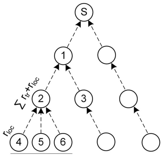 Data acquisition from medical sensors is the first task realized by an IoMT, so the network model considered in this study was formed by a set of IoMT nodes grouped into clusters based on link quality proximity (Figure 2). Our IoMT network is formed by three kinds of nodes: (i) Source node, responsible for generating data and depending on its sensors providing the correspondence type of traffic at rloc rate. In Figure 2, they are labeled as 4, 5, and 6 and they forward their data to an intermediate node located in their range of operation. (ii) The intermediate node is responsible for generating its own traffic (if necessary) and to relay traffic to the next node up to the sink node. Intermediate nodes, which are in the path between the source nodes and sink node (for example, node 1), generate traffic at rate; where rloc is its local traffic (if there were), and rtr is the traffic it receives from other nodes behind it, either source nodes or other intermediate nodes. Consequently, intermediate nodes have a higher traffic relaying burden than source nodes. In Figure 2, they are labeled as 1, 2, and 3. (iii) The sink node is at the top level of the structure and is the node that receives all the traffic generated by the IoMT network, which at this point is , where n is the number of intermediate nodes and (i) is the intermediate node. Moreover, the sink node is responsible for connecting the IoMT with the Internet. The devices beyond the sink node are not part of the proposal of this work; however, an Internet network that uses a transport protocol such as TCP is assumed. In our network model, every source node can collect and transfer data to the next hop until it reaches the sink node. Therefore, the data flow of our network model is considered many-to-one convergent traffic in the upstream direction. Moreover, the application traffic is grouped into three priority levels: urgent traffic (P1); important (P2); and best effort (P3). This classification can cover the transmission requirements of most of the typical physiological signals in an IoMT network []. For example, the ECG signal is traffic P1 (with a data rate transmission of 15,000 bps), the heart rate signal is P2 (with a data rate transmission of 600 bps), and body temperature is P3, which is the one with the lowest transmission requirements (with a data transmission rate of 80 bps) [].