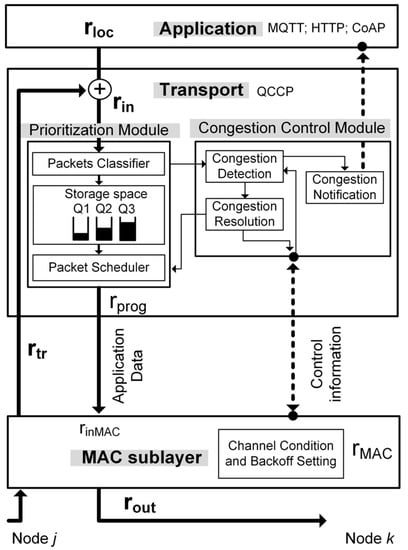 QCCP proposes a cross-layer interaction strategy (represented by dotted lines in (see Figure 3), between the transport layer and the medium access sublayer to implement its congestion control and traffic prioritization functions. QCCP is embedded in the transport layer of all nodes in the IoMT network (source, intermediate, and sink nodes). The above is possible, since all IoMT nodes have the application, transport, network, medium access, and physical layers, as explained in Section 1. QCCP interacts with the MAC sublayer to obtain information about the congestion status of the wireless channel and to set the most appropriate medium access algorithm configuration. In addition, the QCCP can connect to an application-layer protocol to inform the channel of its status (work out of scope). In the model, rin represents the total traffic rate in the node created by rloc (local traffic) and rtr (transit traffic), which are sent to the prioritization module for processing. Subsequently, the traffic is sent to the MAC sublayer at rprog rate according to the priority level of each packet. The application layer assigns a priority tag to each packet based on its QoS requirements. The MAC sublayer transmission rate (rMAC) is determined by the effectiveness of the medium access algorithm in placing packets in a wireless channel.