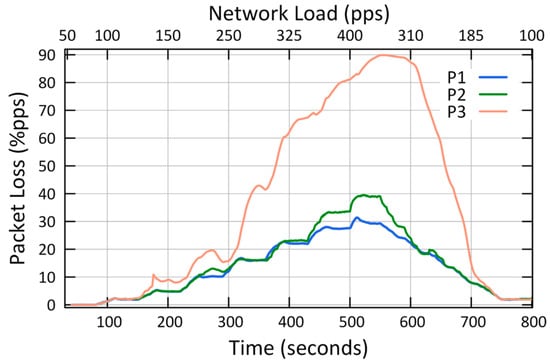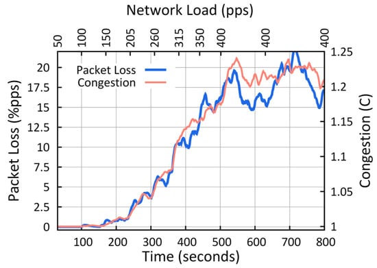 The results of the simulation of these tests are shown in Figure 4, where the X1 axis (bottom) shows the evolution time and the duration of the simulation. The X2 axis (top) shows the evolution of the network load as the traffic flows are activated in each node, as time passes the network traffic increases. Where X1 and X2 are the independent variables in our experimentation. The Y1 axis (left) shows the percentage of packets lost in a node by CAF, and the Y2 axis (right) shows the degree of congestion C measured in the same node, which corresponds to the dependent variables. Another similar graph was obtained for the delay value DP. In this figure, it is necessary to establish two thresholds that divide the output data into three regions: the three congestion states. With this in mind, we propose that a low threshold (TLow) corresponds to a CAF value equal to or less than 1%, and a high threshold (THigh) corresponds to a CAF value equal to or greater than 10%. This coincides with the moment when the output curves of the CAF and C exhibit abrupt changes in their results, which marks a trend in the node congestion degree. For the low threshold, when the CAF is equal to 1%, the value of the network load is 190 pps (equivalent to 47.5% of the total load), and the value of C is 1.012. For the high threshold, when the CAF was 10%, the network load was 285 pps (equal to 71.2% of the total load), and the value of C was 1.092.