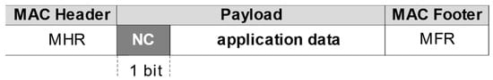 A design premise of QCCP is to control congestion regardless of the other nodes in the network. However, when the surrounding congestion causes a node to reach state III (high congestion), it sends an implicit notification to its neighboring nodes to work together to resolve the congestion. Specifically, QCCP takes one bit from the payload space of a data packet to indicate the presence (“1”) or absence (“0”) of high network congestion, as shown in Figure 5. This field is called high congestion notification (CN). The CN message is sent to its neighboring nodes taking advantage of the transmission nature of a common wireless channel [] and the data reception function of the MAC sublayer of the node []. Thereby, first, the nodes take advantage of the shared network medium to receive packets from the neighborhood in their transmission range, regardless of the destination of each transmission, this is known as the overhearing effect []. Subsequently, when the node’s MAC sublayer receives a packet, it applies a series of filters (one of these is the verification of the destination MAC address) to decide whether to reject (dropped) or accept it (and pass it to higher layers) []. Before applying the filters, QCCP checks the value of the CN field, via the cross-layer connection, and submits the information to the congestion resolution mechanism to act accordingly. In conclusion, effective and fast notification is achieved without the need to send special packets to each node in the network and minimum overhead.
