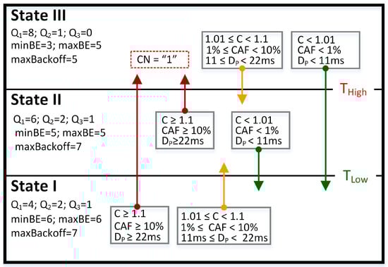 When rin is greater than rMAC than C > 1, the node loses its balance and becomes congested. Depending on the calculated value of C, the mechanism identifies the node congestion state (low, medium, or high) and determines what to do next. However, (2) does not establish a direct relationship with traffic QoS requirements. Therefore, we incorporate packet processing delay (DP) and packet loss owing to channel access failure (CAF) to jointly establish the three congestion states.