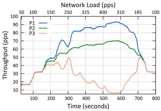 For the packet scheduler, we developed a novel congestion-aware packet service algorithm (CASPA) based on the weighted round-robin algorithm, which simply handles several priority levels and achieves a high response speed []. CASPA takes n packets from each buffer in rotating order according to the set weight and drives them to the MAC sublayer with an output rate of rprog. Furthermore, through the connection between the prioritization and congestion control modules (Figure 3), CASPA knows the current state of network saturation, allowing it to configure the weights of each buffer. With this versatility, the QCCP ensures that more packets of the most critical traffic can take the communication channel in each round. The fundamental operations followed by the CASPA algorithm are: