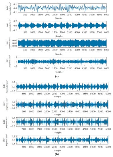 The vibration signals of four states in Figure 7 are decomposed by variational mode decomposition. Because the variational mode algorithm has the advantage of removing some redundant component information, as shown in Figure 8, four IMF component informations are obtained according to different time–frequency domain characteristics.