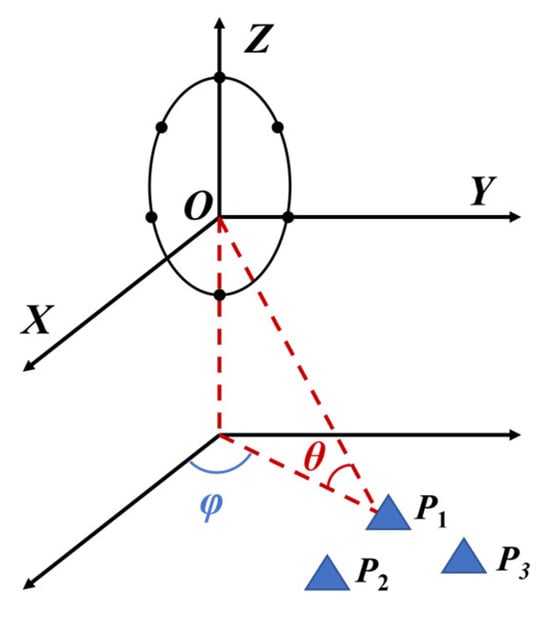 We assume that our radar system is tasked with estimating three coherent sources, as depicted in Figure 1. To facilitate this, a uniform circular array is incorporated into the radar system. The origin point signifies the initial measurement position, and the axis direction is illustrated in Figure 1. The azimuth angle  is the angle formed between the target and the X-axis. Concurrently, the pitch angle  represents the angle between the target and the XOY plane. Targets are configured in an equilateral triangle and are labeled as , , and , with their respective coordinates and angles designated as ,, and ,,. respectively.
