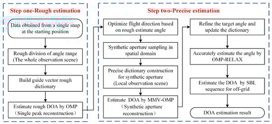 To address these challenges, this paper introduces a two-stage DOA estimation technique. Initially, the original aperture facilitates a rough angle estimation, which then determines the refinement measurement grid and sets the flight trajectory. Subsequently, merging the initial target angles with spatial samples from the moving target, these samples are treated as equivalent spatial synthetic array samples. A measurement dictionary, rooted in spatial samples, is established, and sparse reconstruction is applied for angle estimation. To bolster DOA estimation accuracy, a sequential estimation method, amalgamating Bayesian proportion parameter estimation with dictionary refinement, is designed. The method presented holds three distinct advantages: