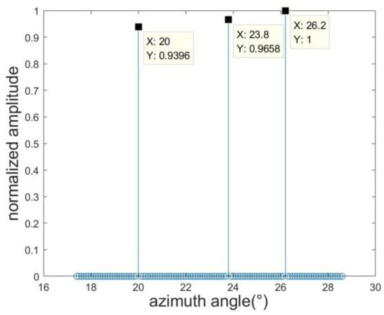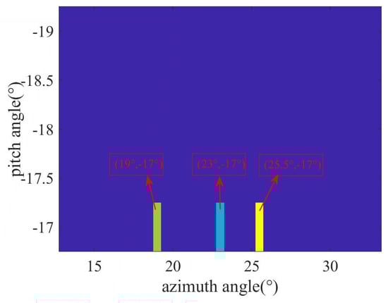 Using the initial rough estimation (), we plan the trajectory. The half-power beam width corresponding to the synthetic aperture is . Consequently, the angular search range for the azimuth angle becomes , where  represents the azimuth angle search grid during the initial estimation. Since the target elevation angle remains relatively consistent throughout the search phase, the search range for the elevation angle is set at . We then construct a dictionary matrix corresponding to this refined angle based on the established azimuth and elevation angle grid. Figure 5 displays the refined estimation result. It is evident that all three targets have an estimated elevation angle of −17°, and their estimated azimuth angles are 19°, 23°, and 25.5°, respectively. While the exact azimuth angles of the targets are not pinpointed, the possibility of estimating the three targets within the same beam range became feasible after multiple spatial samplings and refined angle divisions. As there is a greater focus on azimuth angle information during the search state, the rough estimation of the elevation angle is used for a refined azimuth angle estimation. Compared to the first step’s rough estimation, it is clear that the three targets can be distinguished, but the angle values are still not accurate.