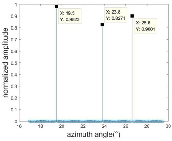 To further enhance estimation precision, we employ the RELAX algorithm to fine-tune the target azimuth estimation further. Following the RELAX algorithm’s methodology, when estimating the  target, the center of the previous estimation result  is utilized to construct the refined angle search grid  for the  target. In our study, we define , with the resulting estimations illustrated in Figure 6. The azimuth angles for the three targets are determined to be 19.5°, 23.8°, and 26.6°, which signifies a marked improvement in estimation accuracy compared to the results of the OMP algorithm. Figure 6, based on the elevation angle estimation result of Figure 4 and the azimuth angle estimation result of Figure 5, re-divides the azimuth grid. The results indicate that after processing with the OMP-RELAX algorithm, the estimation accuracy is further improved.