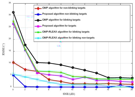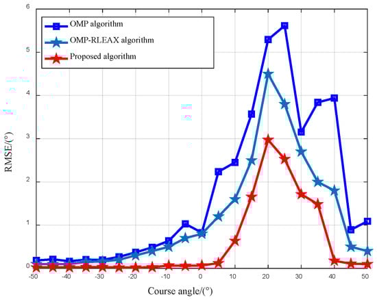 As can be seen from the figure, under different heading conditions, the proposed method has higher angle measurement accuracy than the OMP algorithm. The target azimuth angle is  for the proposed method, and the OMP algorithm in the heading angle range  has a significantly lower angle measurement accuracy compared to other heading angles, with RMSE reaching its peak at heading angles of 20° and 25°. The reason for this phenomenon is that when the heading angle is close to the target angle, the spatial sampling of the aircraft cannot form an effective aperture, so the angle resolution does not improve.