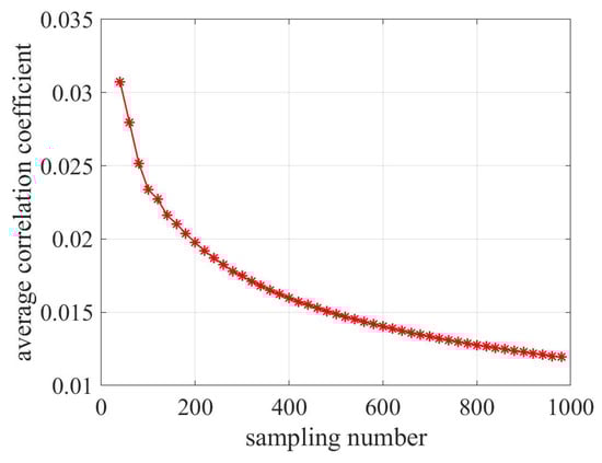 For the analysis, the aircraft’s maximum spatial sampling points are capped at 1000, maintaining an SNR of 20 dB and a heading angle of −60°. Figure 11 visually represents the mean correlation coefficients of the dictionary matrix across distinct sampling points.