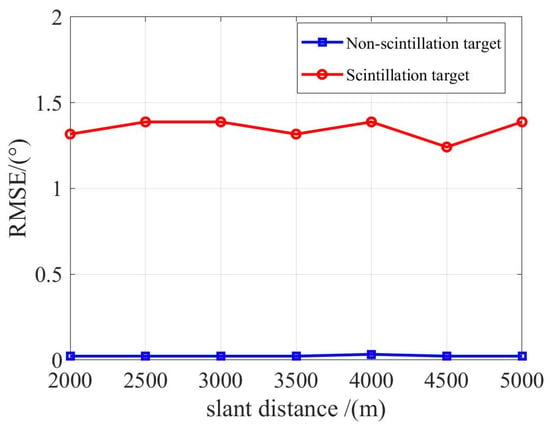 To assess how the distance between the aircraft and the target affects angle measurement precision, we examine two distinct scenarios: those involving flickering targets and those with non-flickering targets. Figure 12 illustrates the angle measurement precision for targets at varying distances.