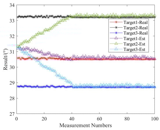 Acknowledging that a target might not align with the precise grid during sparse reconstruction, this study introduces a sequential SBL technique to address the off-grid issue. The outcome of this method is presented in Figure 7. In comparison to the actual target value; the error margin is a mere 0.1°. Collectively, these experiments underscore that our proposed method boasts commendable estimation accuracy. Figure 7, based on the angle estimation of Figure 6, displays the estimation results processed by the SBL algorithm. It is evident from the figure that the estimation result is almost consistent with the target angle.