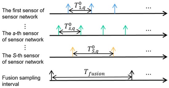 Suppose the multi-sensor network consists of S radar nodes, and the coordinate of the s-th  radar node in the multi-sensor network is . Due to the different working modes of the sensor nodes in the sensor network, their initial sampling time  and sampling interval  may also be different for the target q. Based on this, Figure 1 shows the asynchronous measurement model of target q in the fusion interval .