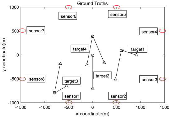 The tracking scene is set to multiple targets appearing in four possible locations or derived from other targets, and the observation area is . There are seven targets in the scene. For simplicity, it is assumed that each target performs uniform linear motion.