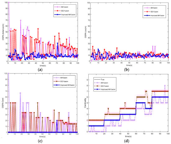 Among them,  is the target-state vector, and the two parameters of the OSPA distance are set to  and , respectively. The smaller the OSPA distance is, the higher the accuracy of the target-state estimation is.
