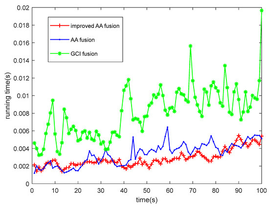 Figure 6 shows the running time comparison of each algorithm. The GCI fusion algorithm has the longest running time because of its algorithm structure. The improved AA fusion algorithm has a particular improvement in the running efficiency compared with the AA fusion algorithm. The reason is that the target measurement information is associated, thereby reducing the calculation of redundancy and ultimately reducing the algorithm’s running time.