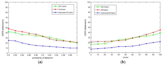 To better show the influence of the detection probability and clutter rate changes on the accuracy of asynchronous multi-target tracking in multi-sensor networks, Figure 7 shows the performance comparison of each algorithm under different detection probabilities and different clutter rates. It can be seen from the graph that the improved AA fusion algorithm has the lowest OSPA distance error when the detection probability changes and the clutter rate changes, which also directly proves the robustness of the improved AA fusion algorithm in the asynchronous multi-target-tracking environment of multi-sensor networks.