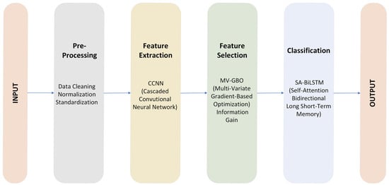 The workflow depicted in Figure 2 illustrates our data processing pipeline. It starts with the initial input data, which goes through the preprocessing phase, including data cleaning, normalization, and standardization. The next step involves feature extraction using a cascaded convolutional neural network (CCNN), feature selection using multi-variate gradient-based optimization (MV-GBO), and information gain, and then the optimized data enters the SA-BiLSTM classifier, resulting in the final execution, as shown in Algorithm 1.