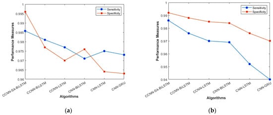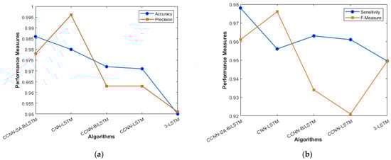 Table 4 presents the performance comparison of various algorithms; the Proposed Algorithm exhibited an accuracy of 98.6%. Its precision and sensitivity stood at 97.8%, with an F-measure of 96.1% []. While CNN-LSTM [] registered a high precision of 99.6%, its sensitivity was slightly lower at 95.6%, resulting in an F-measure of 97.6%. The CCNN-BiLSTM method followed closely, with metrics showing 97.2% accuracy, 96.3% precision and sensitivity, and a 93.4% F-measure. The CCNN-LSTM showed a similar performance, with 97.1% accuracy and an F-measure of 92.1%. Among the methods, 3-LSTM [] had the lowest metrics, with 95% accuracy and an F-measure equal to its sensitivity of 94.95%.