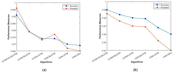 Figure 4a, b represents the sensitivity and specificity of the KDD’99 and TON_IoT Datasets. The balance between true positive and true negative is shown using this graph, wherein the proposed model (CCNN-SA-BiLSTM) performed better than others. Figure 5a, b represents the accuracy and precision of the different models on different datasets. It shows the overall classification of the model. The accuracy of the proposed model is the best among all the models, which is attributed to the Bidirectional nature of the model, which considers both past and future data and results in good predictions.