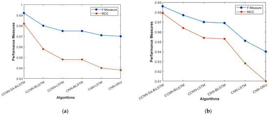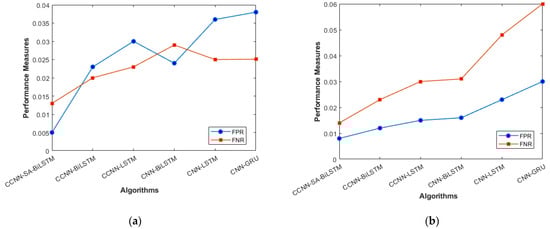 The overall holistic view of the model is finally represented by F_Measure and MCC, which are represented in Figure 8a, b. The overall balance between precision, Recall, and correlation is shown, and the model (CCNN-SA-BiLSTM) performed better than the others. The classes are balanced, which is one of the factors that leads to low FPR and FNR for our proposed work, which can be seen in Figure 11 as well. The cascaded CNN captures the hierarchical features effectively, reducing the FPV and FNV significantly. The self-attention mechanism in our work enhances the long-term dependencies, which leads to better results when compared with other existing models.