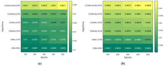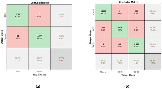The heatmap shown in Figure 10, extracted from Table 5 and Table 6, shows the accuracy with five different epochs, where (a) represents KDD’99 and (b) represents the TON_IoT dataset. The accuracy of the DoS class in the KDD’99 dataset as per the confusion matrix is 99.6%, whereas that of the normal class is 98.6%, as represented in Figure 10a.