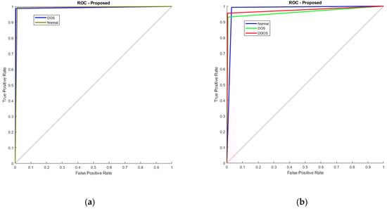 Additionally, Figure 12 illustrates the RoC curve, with (a) denoting KDD’99 and (b) representing TON_IoT. The RoC plots the true positive rate against the false positive rate at various thresholds. In KDD’99, the AUC value is nearing 1, representing the classifier is good at differentiating among both the classes, whereas in TON_IoT, one vs. all analysis is used, wherein the first normal class is taken as positive and the rest as negative, the next being DoS vs. all, and finally DDoS vs. all. The AUC of 0.98, 0.975, and 0.965 represent that the model is able to clearly distinguish between the classes and represents good model performance.
