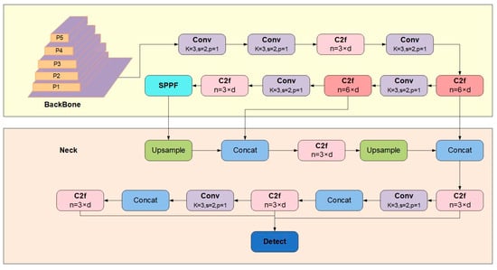 The backbone section serves the purpose of feature extraction and encompasses modules such as Conv, C2f, and SPPF. Within the Conv module, operations encompass convolution, batch normalization (BN), and SiLU activation functions. YOLOv8n introduces an innovative C2f structure designed to acquire residual features, thereby upholding gradient-flow information while ensuring a lightweight design. Meanwhile, the SPPF module, known as spatial pyramid pooling, converts the feature map into a feature vector of fixed dimensions.