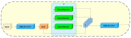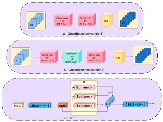 Although YOLOv8n primarily deploys C2f for feature extraction, C2f contains multiple bottleneck layers, as seen in Figure 3c. Each bottleneck includes various convolutional kernels—1 × 1, 3 × 3, and 1 × 1—resulting in multiple parameters and high complexity. Hence, this study revamps the Bottleneck structure, replacing it with GhostBottleneck layers, substantially reducing parameters, simplifying models, and enhancing detection. GhostBottleneck employs channel grouping for feature extraction, aiding the model’s diverse feature learning, as illustrated in Figure 4.