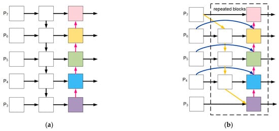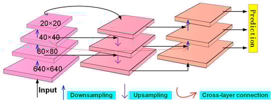 Specifically speaking, firstly, building upon the PAN structure, it was observed that certain nodes possessed unidirectional inputs without featuring any element of feature fusion. These nodes contributed relatively less to the feature-fusion process while introducing additional computational load and parameters. To enhance the efficiency of object detection, a strategy was employed, namely, the removal of nodes with lower contributions. Secondly, within the same channel, the concept of skip channels was introduced between the input and output nodes. This allowed each pair of bidirectional pathways to be treated as a feature layer, enabling more comprehensive information fusion. This approach effectively captured more fusion information while maintaining a controllable computational load. The proposed improved structure is illustrated in Figure 6.