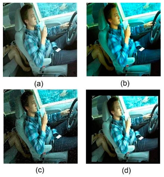 To boost the model’s generalization ability, we enriched the dataset with diverse augmentation techniques—adjusting brightness, saturation, adding noise, and random translations. This expanded the dataset to 3300 samples (see Figure 9). Distracted driving behaviors were labeled using text files. These files had five columns: label category, label-box center’s x and y coordinates, width, and height.