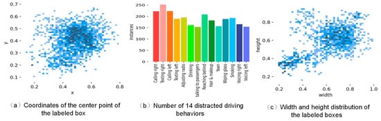 The dataset was divided into an 8:2 ratio for training and validation sets. In the training set, the data distribution across 14 distracted-driving-behavior categories and the details of the label boxes are shown in Figure 10.