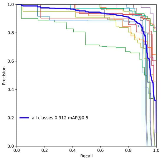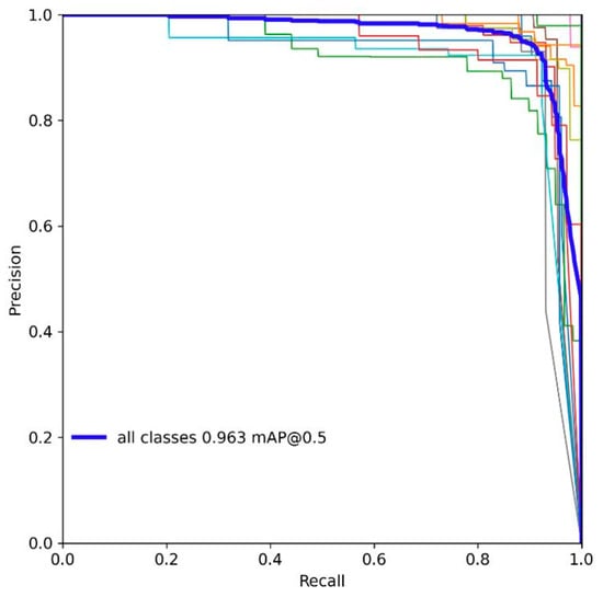 To assess the model’s performance with greater accuracy, during the testing phase, we plotted the PR curve of the model before and after improvement at an IOU of 0.5, as shown in Figure 11 and Figure 12.