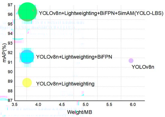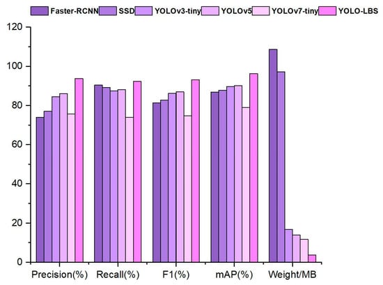 Analyzing the data in Table 3, it is evident that among numerous models, the Faster R-CNN model demonstrates comparatively lower detection accuracy. Moreover, this model necessitates the largest weight files, consequently demanding more computational resources and time for training and inference. In comparison to other single-stage object-detection models, Faster R-CNN fails to exhibit notable advantages. The SSD model also falls short in terms of detection accuracy and model weight. In contrast, YOLOv3-tiny, functioning as a lightweight model, boasts lighter weight. Its multi-scale prediction layers contribute to capturing objects of varying scales, thereby yielding superior detection performance. Noteworthy is the fact that YOLOv5, an evolution of YOLOv3-tiny, introduces data augmentation and the focus structure to attain more enriched channel information. As for YOLOv7-tiny, it possesses smaller model weight compared with YOLOv5, albeit sacrificing a certain degree of perceptual capability. The proposed YOLO-LBS model in this paper achieves lightweight architecture while simultaneously enhancing the model’s feature fusion and extraction capacities for objects of diverse scales. In summary, taking into account the balance between detection speed and accuracy, the algorithm proposed in this paper achieves the highest mAP value of 96.3%, while also having the fastest detection speed of 75.76 fps.
