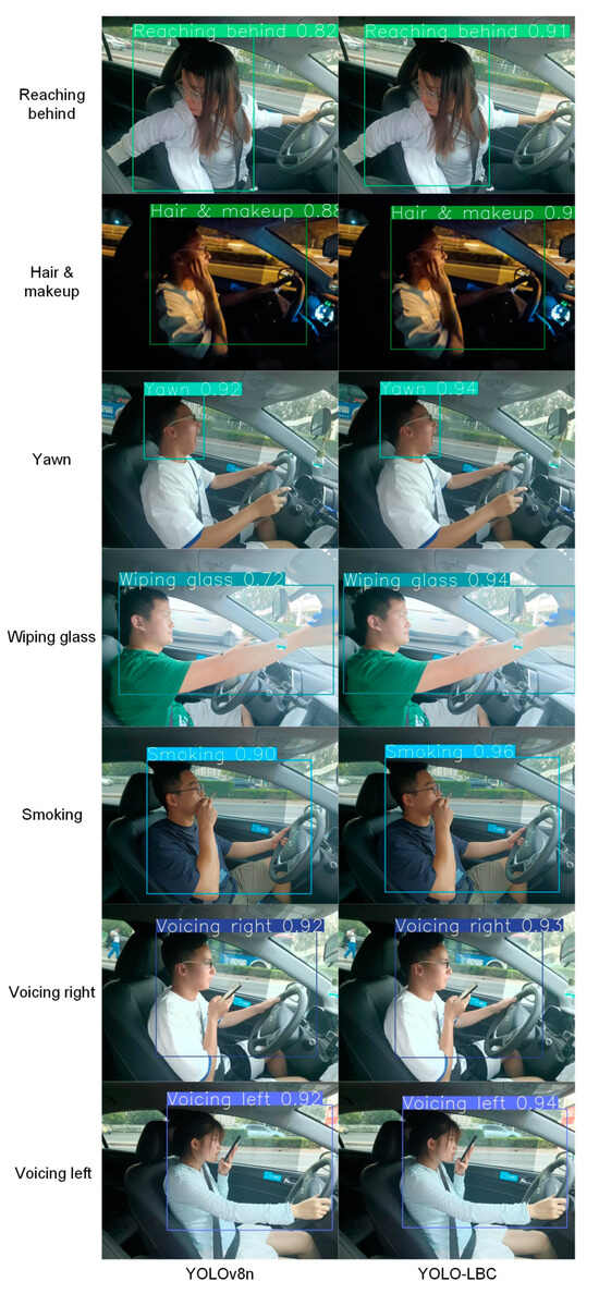 Table 1 illustrates that the YOLO-LBS model proposed in this study exhibits superior performance across various metrics including precision, recall, F1, and mAP, when compared with YOLOv8n (with increases of 2.8%, 1.7%, 2.3%, and 5.1% respectively). This advantage stems from the enhancements made to the BiFPN architecture, which augment the model’s feature-extraction capabilities for capturing distracted-driving behaviors across different scales. Additionally, the introduced attention mechanism effectively mitigates the interference caused by complex backgrounds in recognizing distracted driving behaviors. It is worth noting that the YOLO-LBS model proposed in this study reduced parameters by 39.3% and increased speed by 15.7%. This accomplishment can be attributed to the lightweight design of GhostConv, along with the innovative GhostC2f architecture, both of which significantly contribute to the reduction of model parameters. In summary, the model proposed in this study stands out in terms of both lightweight design and recognition accuracy when compared with the baseline model.