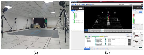 Vicon infrared three-dimensional motion-capture system. (a) Actual situation; (b) situation displayed by Nexus software.