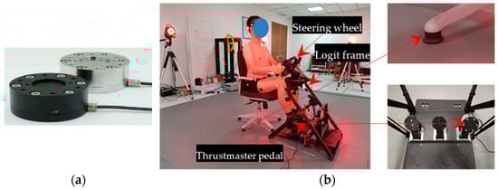 Figure 3a shows the LH-SZ-6W three-dimensional force sensor fixed on the pedal using a 3D-printed fixture during the experiment. Figure 3b shows the pedal-operation simulator with a 3D-printed steering wheel and a diameter of 450 mm. The frame is a Logitech g29 racing simulator, in which the steering wheel height, steering wheel inclination angle, pedal center height, etc. can be adjusted. The pedal is a Thrustmaster racing pedal, a floor-mounted pedal with adjustable pedal inclination and feedback force. The feedback forces of the accelerator, brake, and clutch pedals were set to 40 N, 120 N, and 50 N, respectively, with a distance of 70 mm between two adjacent pedals []. The seat can be adjusted to a height of 405–505 mm, with a backrest angle of 8–18° and a vertical H-point rise of 0°.