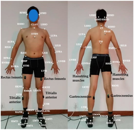 Research has shown that in the process of pedal operation, the main muscles that generate force and exhibit apparent changes are the rectus femoris, hamstring, gastrocnemius, and tibialis anterior muscles []. The hamstring includes the semimembranosus, the semitendinosus, and the long head of the biceps femoris. The gastrocnemius includes the medial and lateral head of the gastrocnemius muscle. This study was conducted in respect of four muscles: the rectus femoris, the long head of the biceps femoris in the hamstring muscle group, the medial head of the gastrocnemius in the gastrocnemius muscle group, and the anterior tibial muscle.