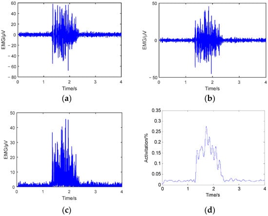 Calculation of muscle activation: (a) original EMG signal, (b) denoised EMG signal, (c) rectified EMG signal, and (d) muscle activation.